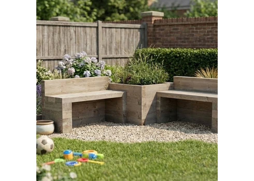Cette configuration de banc d'angle est idéale pour combler un vide dans votre jardin. le montage des produits WoodBlocX est facile car composés d'éléments légers et faciles a manipuler et lever, rendant leur construction à la portée de tout le monde. Ils sont également une excellente alternative aux traverses de chemin de fer, parfois lourdes et difficiles à manœuvrer.