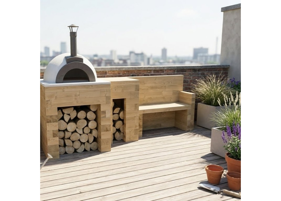 Construisez une base de four à pizza parfaite dans votre jardin ! Elle fera votre bonheur et celui de tous vos proches ! Conçue pour soutenir votre four à pizza, elle possède un plan de travail séparé, un espace pour ranger le bois en dessous, et un banc pour s’asseoir… C’est ce qu’on appelle un kit WoodBlocX multifonctions !
