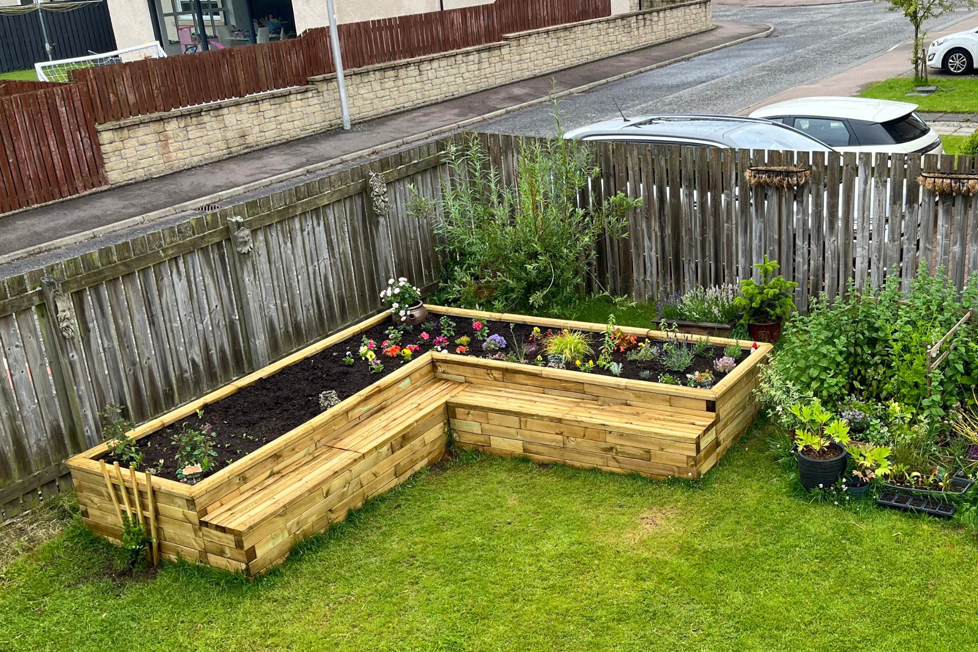 La jardinière surélevée en L avec son banc intégré s’intègre parfaitement dans le jardin de David. Apportant tout l’espace voulu pour le jardinage et la détente, cette structure en L est idéale pour l’angle du jardin bien ensoleillé. La banquette permettra d’accueillir les amis et la famille pendant de nombreuses années.