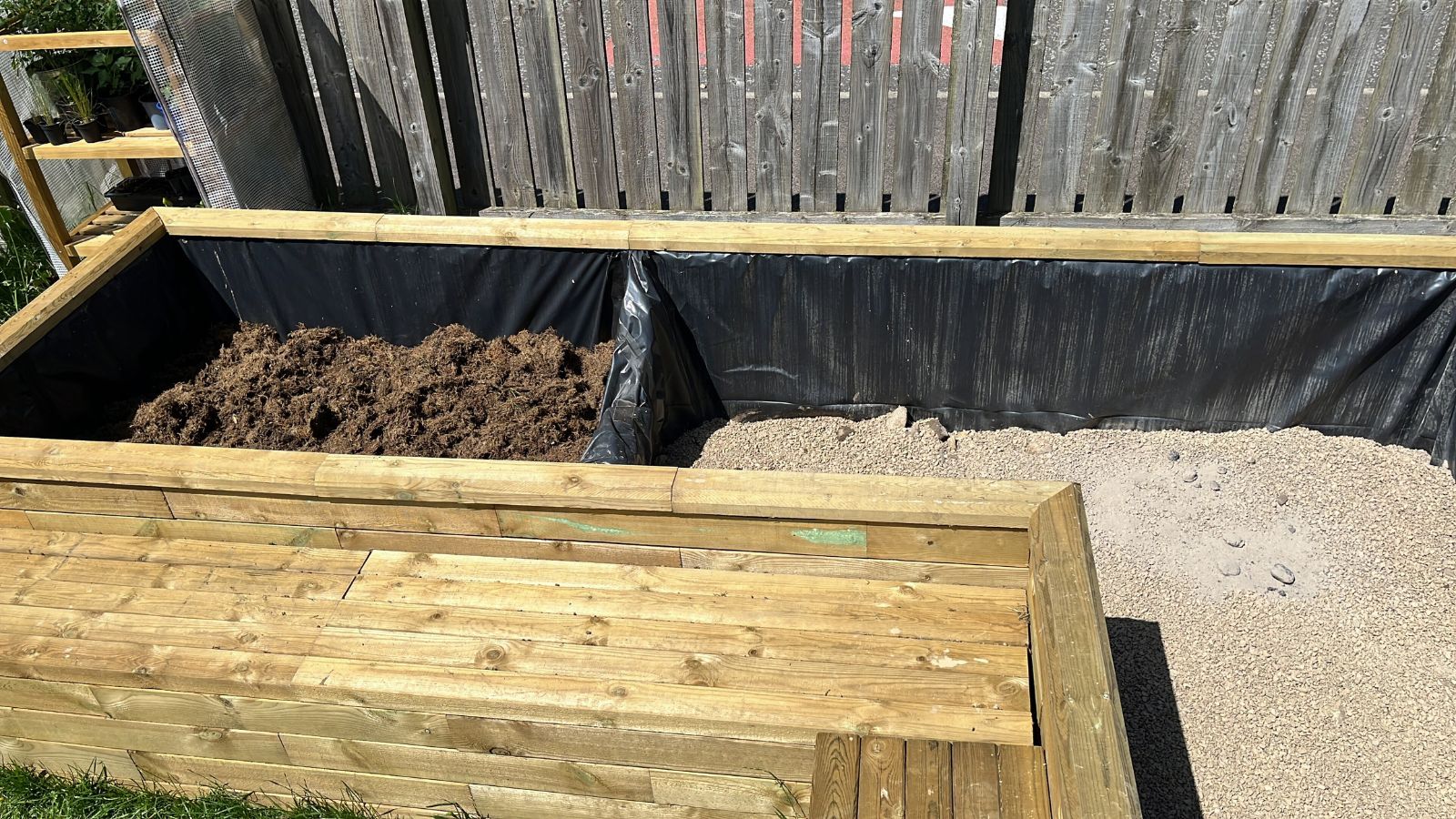 Lorsqu’on construit une jardinière surélevée, il est important d’ajouter une bâche de protection interne pour créer une barrière entre le bois et le terreau, et garantir la longévité de la jardinière. Avant d’ajouter le rebord final, David a installé une bâche de protection. Une fois le rebord ajouté, David a rempli sa jardinière de terreau et a commencé à planter des arbustes et des plantes.