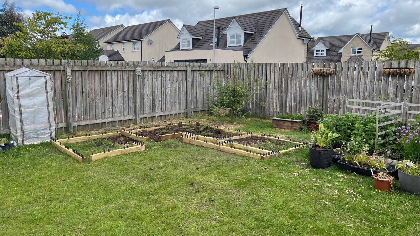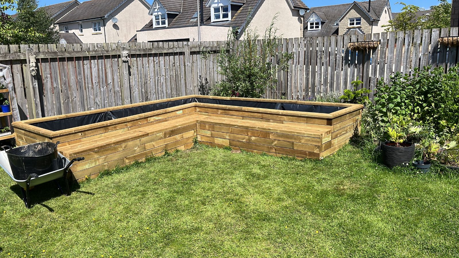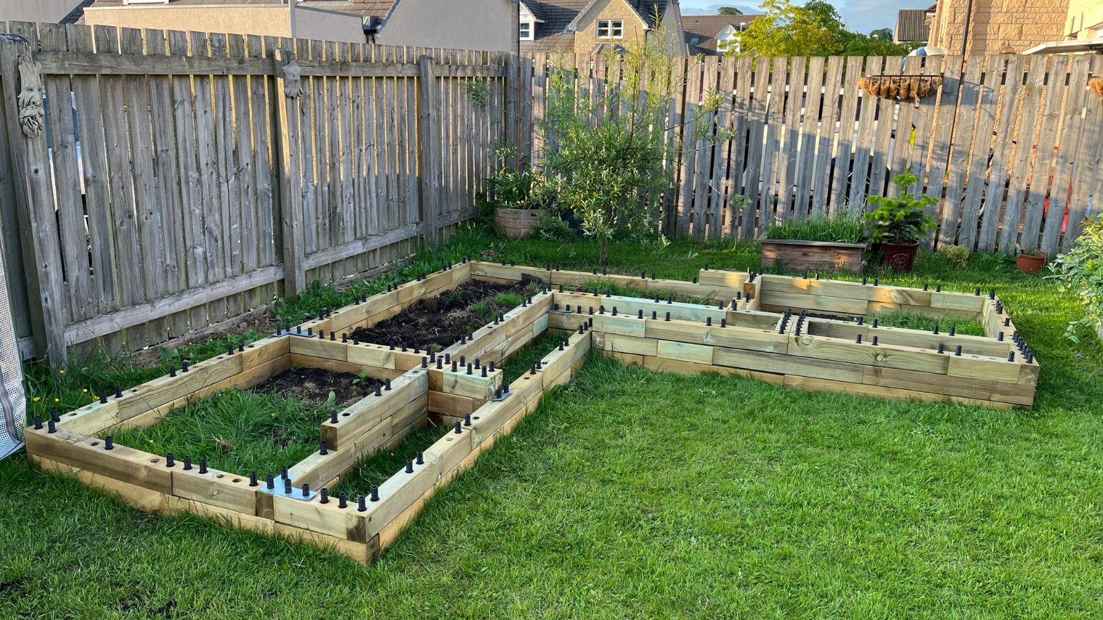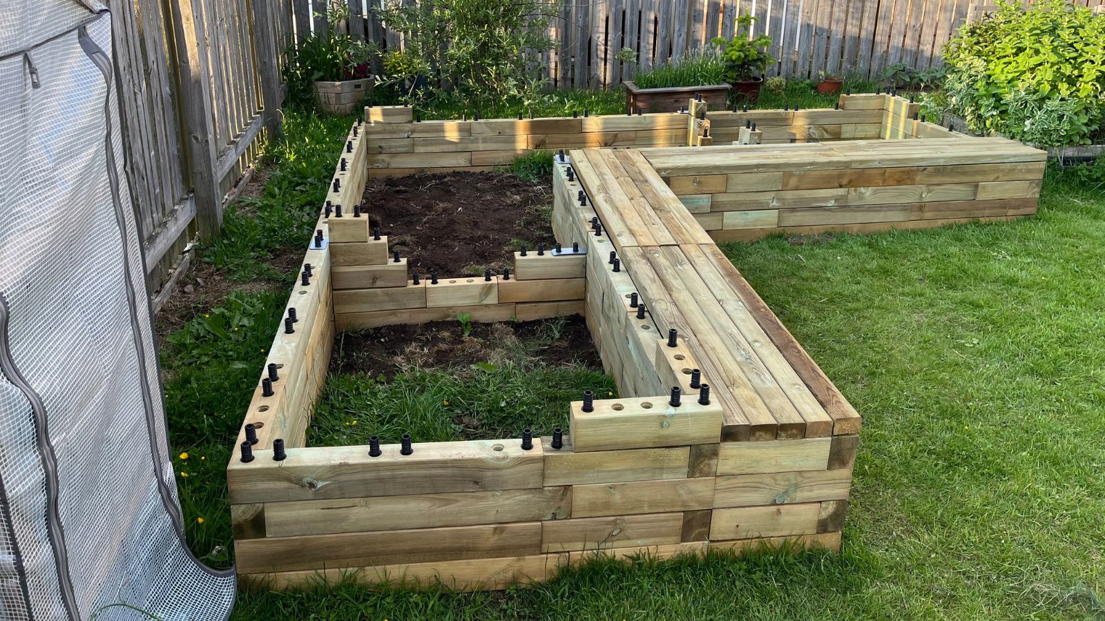 Le jardin existant de David comprenait un gazon relativement plat avec suffisamment d’espace pour y placer une grande jardinière surélevée. Afin d’optimiser l’espace, il a décidé qu’une structure en L occuperait parfaitement l’angle du jardin vers la clôture.