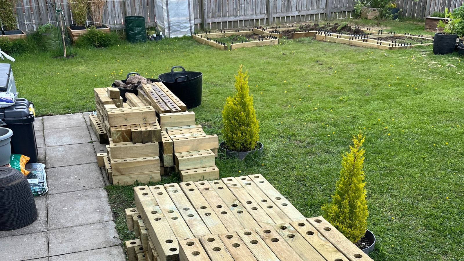 Pour commencer, David a placé la première rangée de WoodBlocX à l’endroit où la jardinière allait se situer. Il a ensuite travaillé un peu le sol et retiré du gazon pour s’assurer que le sol était complètement de niveau avant de commencer le montage. Nous vous recommandons de niveler complètement le sol avant de commencer. Vous pouvez utiliser du sable pour cela. Une fois son sol nivelé, David a suivi les instructions pas-à-pas pour commencer à monter la jardinière.