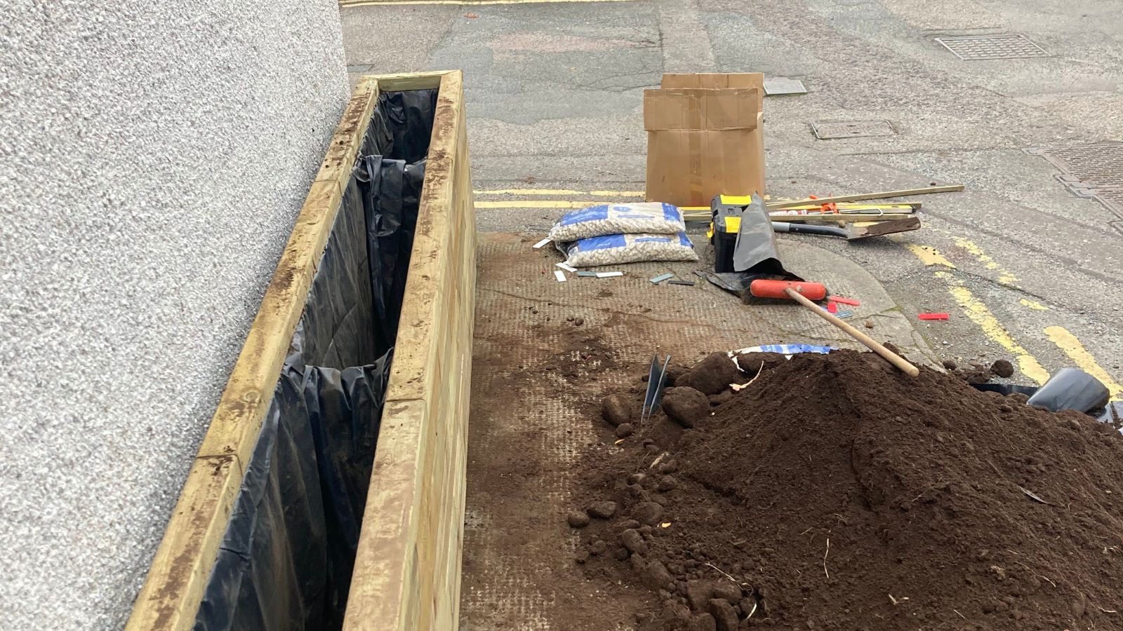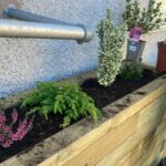 Pour maximiser la durée de vie de la jardinière WoodBlocX, une bâche interne (qui a été ajoutée à la commande) a été installée sous le rebord afin de couvrir tous les côtés et les contreforts de la jardinière. Pour faciliter le drainage de l’eau, on a pratiqué de petits trous au fond de la bâche et versé quelques sacs de gravier sur le fond pour créer une simple couche de drainage. La terre et les plantes ont été gracieusement données à la salle Yoga Collective par un fournisseur local et la jardinière a pu être plantée tout de suite après son montage.