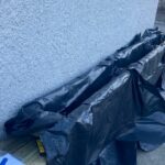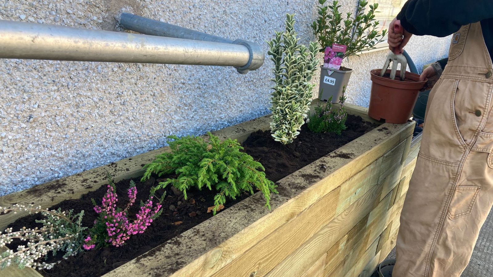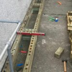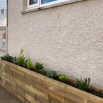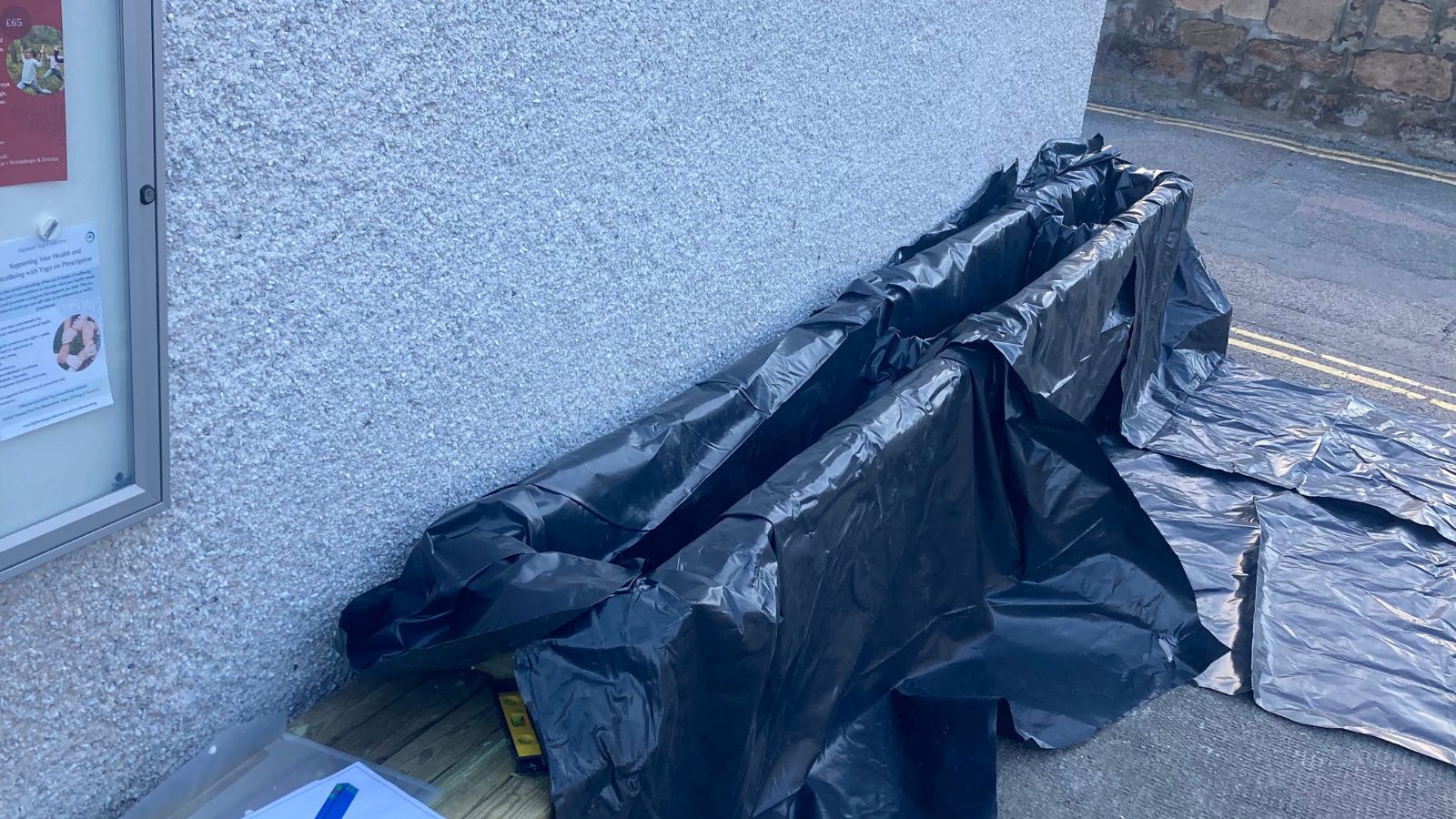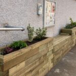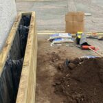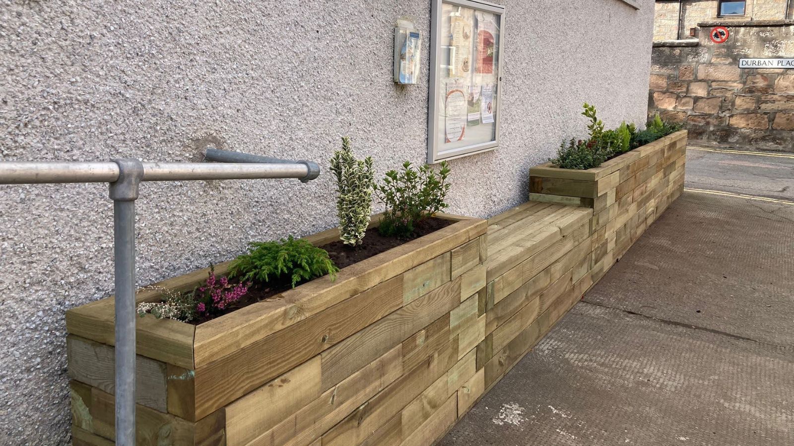 Pour être sûr que le panneau d’affichage n’ait pas besoin d’être déplacé, le banc devait faire 1,5 m de largeur et commencer après la première jardinière à 1,35 m de long. L’utilisation d’un rebord moderne a permis à la structure d’être montée proche du bâtiment et de ne pas trop dépasser près de l’accès piéton, contrairement à notre rebord traditionnel qui possède un dépassement de 12,5 mm de chaque côté.
