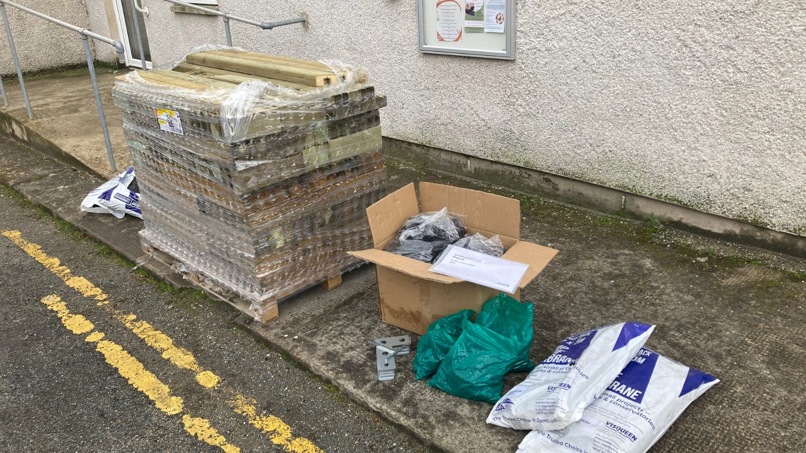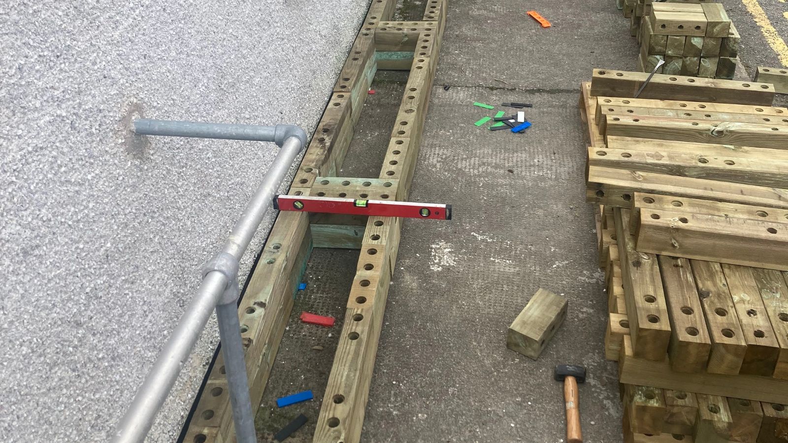 Étant donné que cette commande était locale (la salle se situe à quelques kilomètres de notre scierie à Dingwall dans les Highlands écossaises), les éléments WoodBlocX du design ont été rassemblés, expédiés et livrés sur palette en quelques jours seulement ! Et comme le design allait être monté sur du béton, aucune préparation n’a été nécessaire au sol.