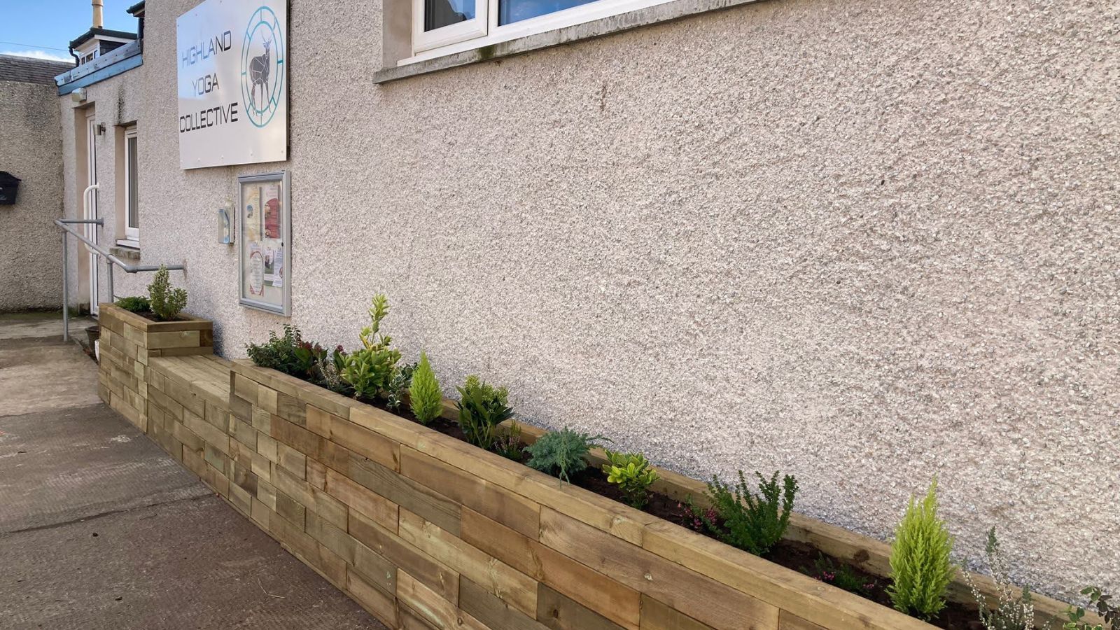 La jardinière surélevée WoodBlocX terminée avec banc intégré, se love parfaitement dans l’espace disponible et a complètement transformé l’extérieur du bâtiment. La jardinière, qui s’étale sur toute la longueur de la salle de yoga, crée un point d’intérêt devant le bâtiment et fournit également un espace pour que les élèves puissent s’asseoir avant ou après leur classe.