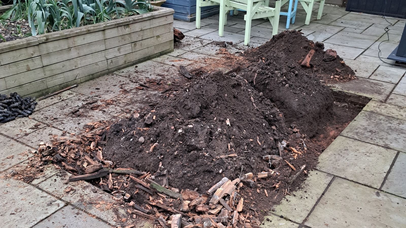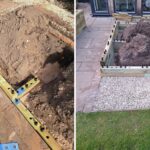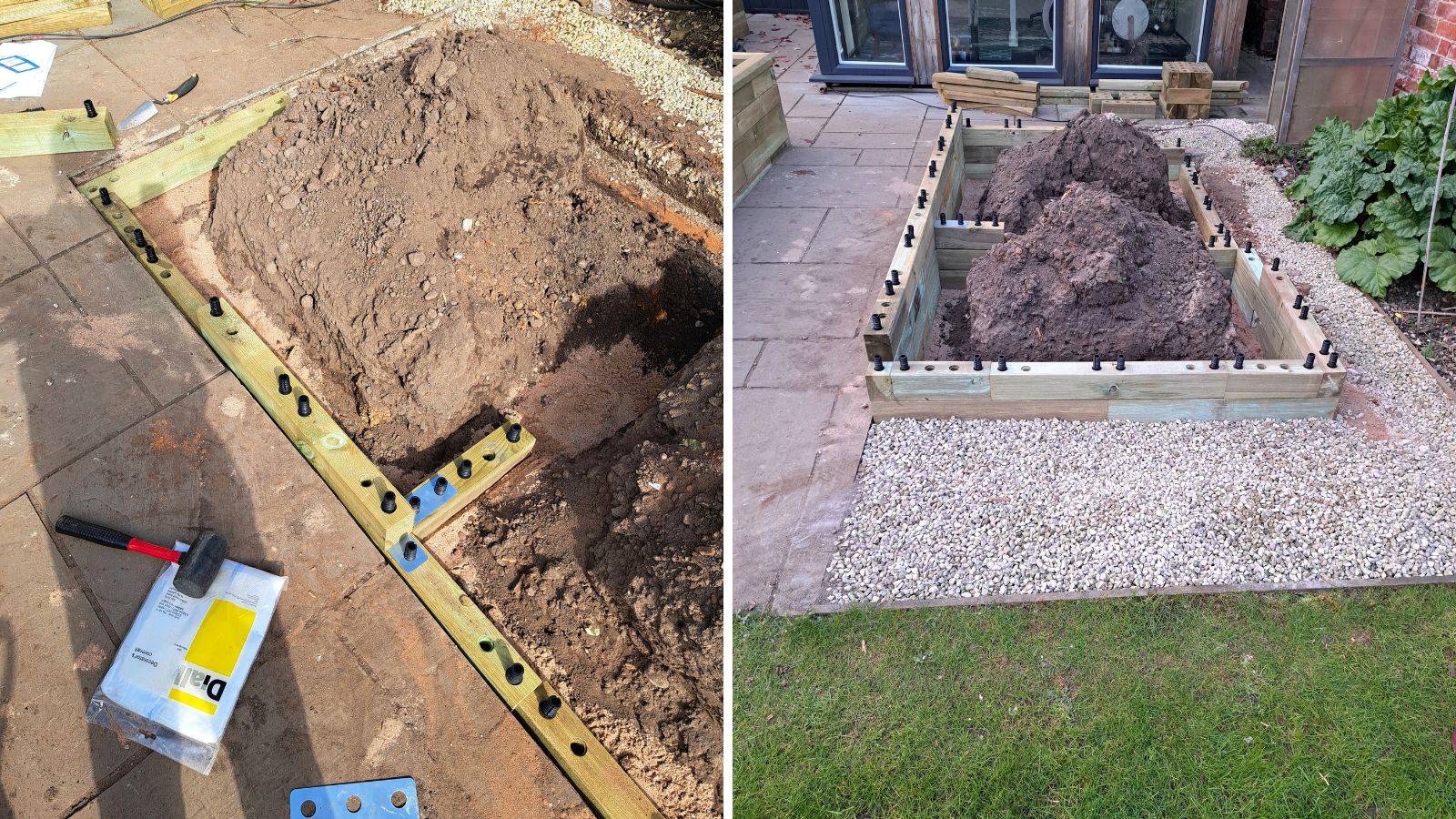 Ian a d’abord préparé le terrain en retirant les dalles pour exposer le sol meuble dessous. Avec ce type de sol, nous fournissons des tiges d’ancrage pour sécuriser la jardinière au sol. Vous pouvez construire WoodBlocX sur n’importe quelle surface : pour les sols durs comme le béton, les dalles et les terrasses, nous proposons des équerres de fixation.