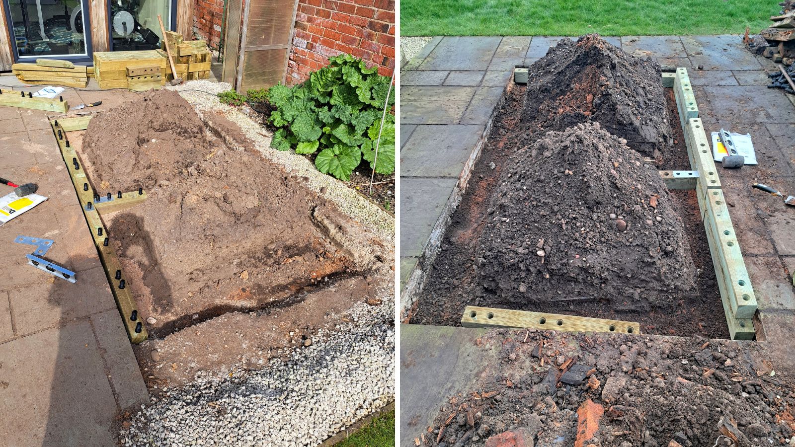 Ian a choisi notre style de rebord traditionnel pour terminer ses jardinières. Ce style est chanfreiné, possède un léger dépassement et les coins sont coupés en biseau. Vous pouvez en savoir plus sur nos styles de rebords ici. Une fois le rebord en place, Ian a rempli les jardinières de terreau, prêtes pour semer ses légumes.