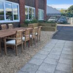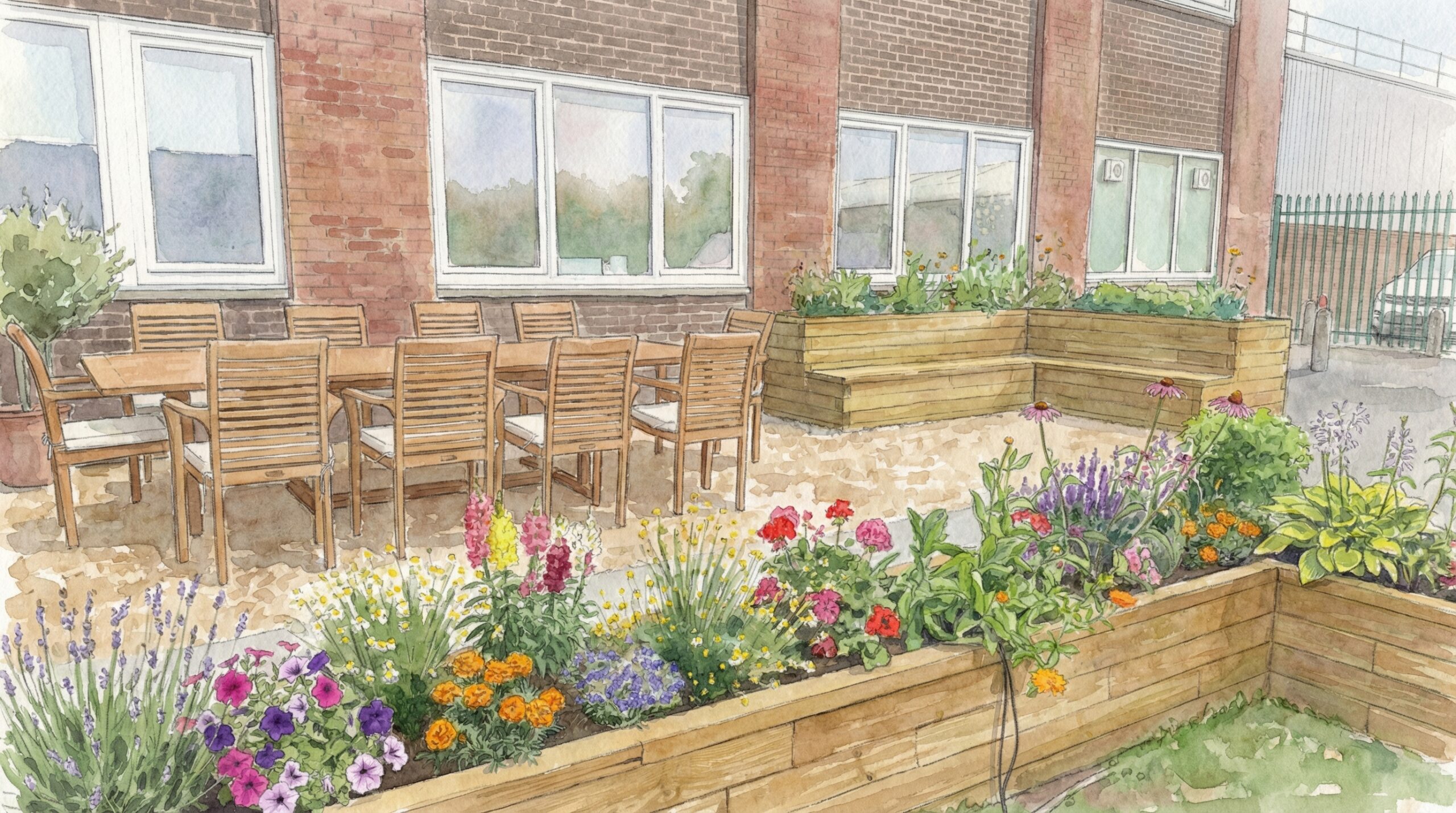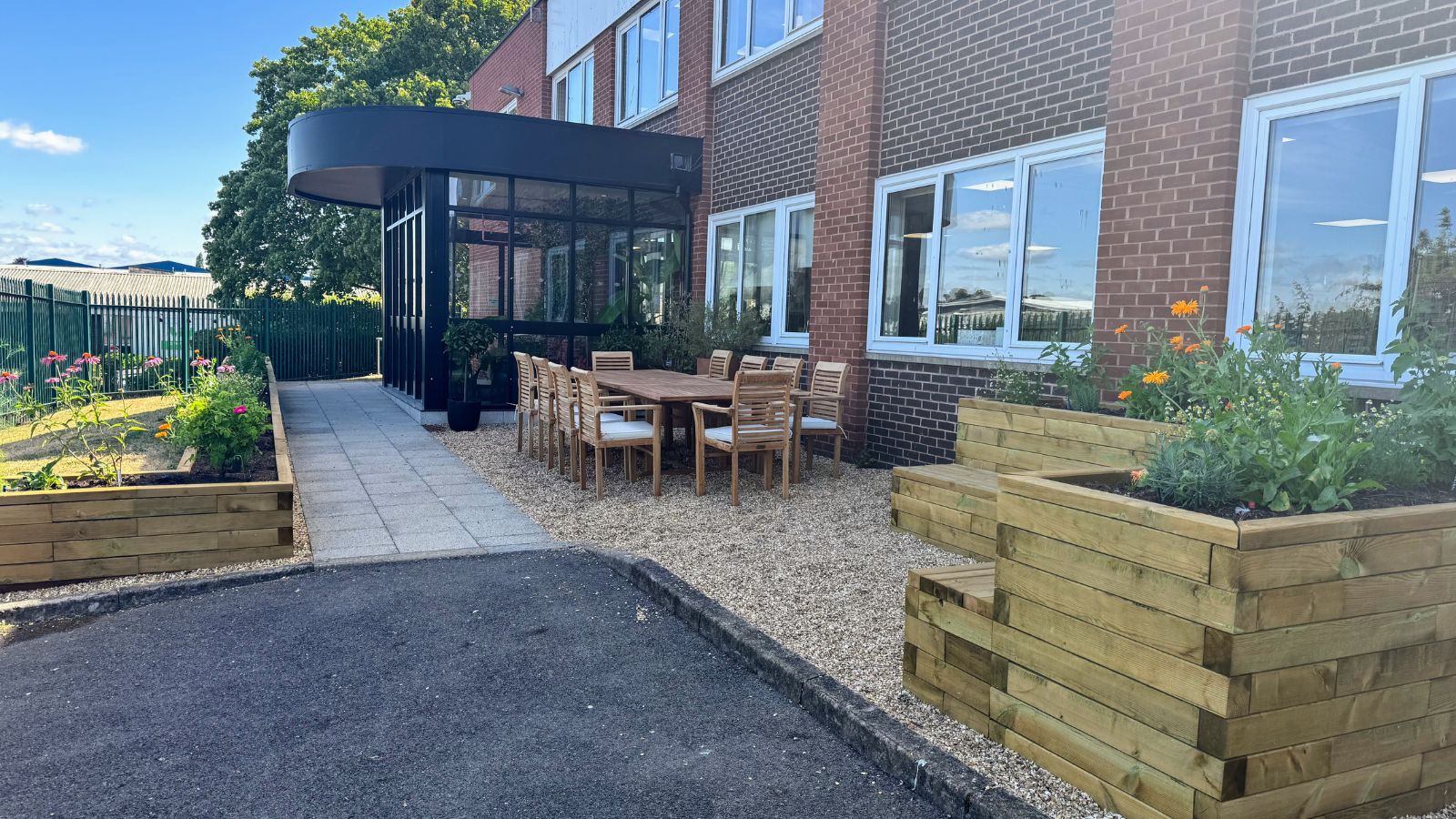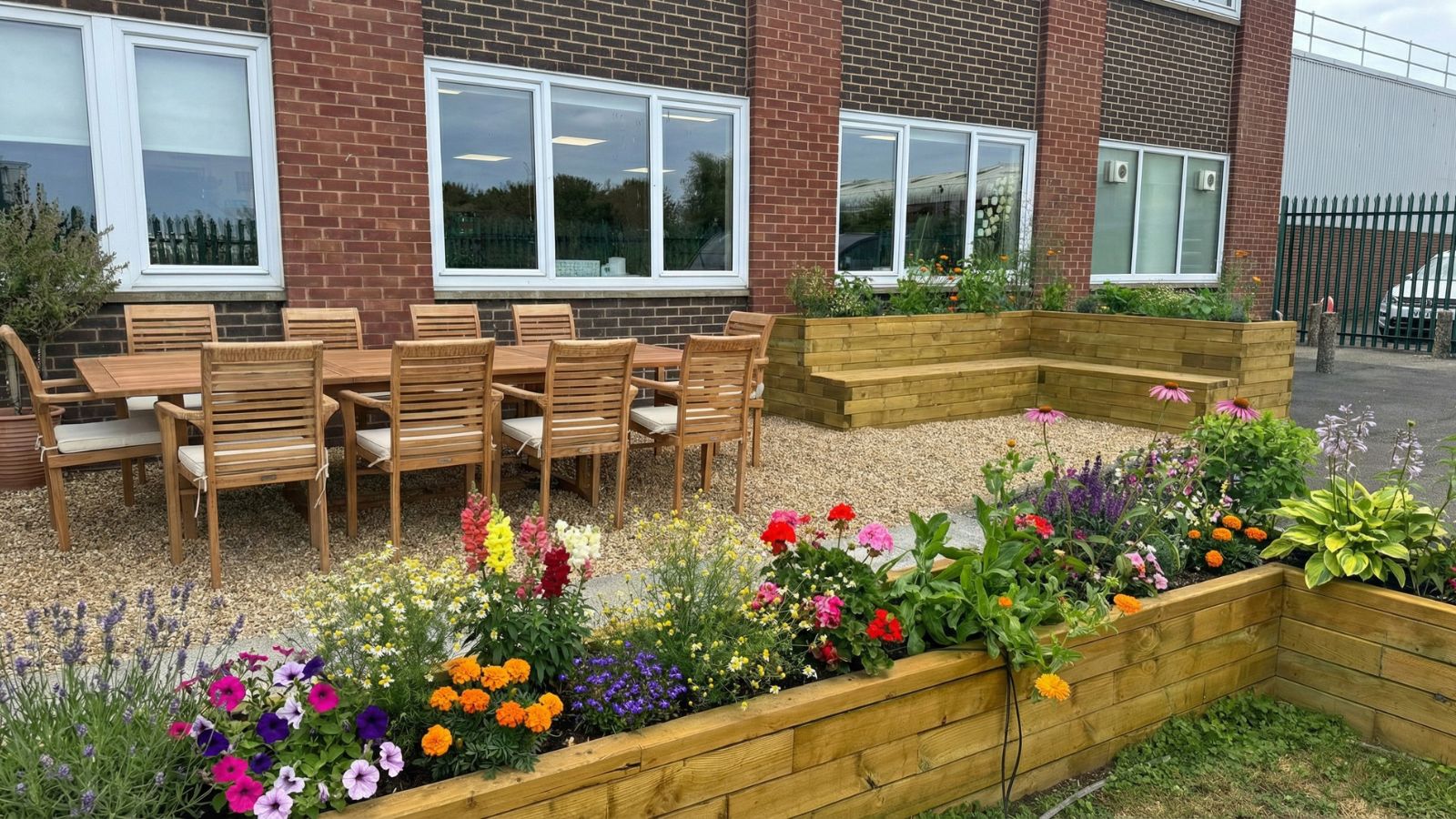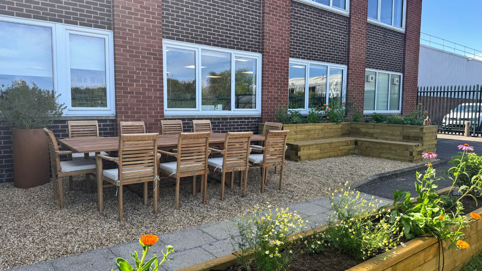 L’ajout d’une jardinière en L avec banc intégré dans le coin opposé complète parfaitement l’espace, en créant plus de place pour s’asseoir à côté de la table et des chaises. La cour extérieure est désormais un endroit attrayant pour que les collègues se retrouvent dehors.