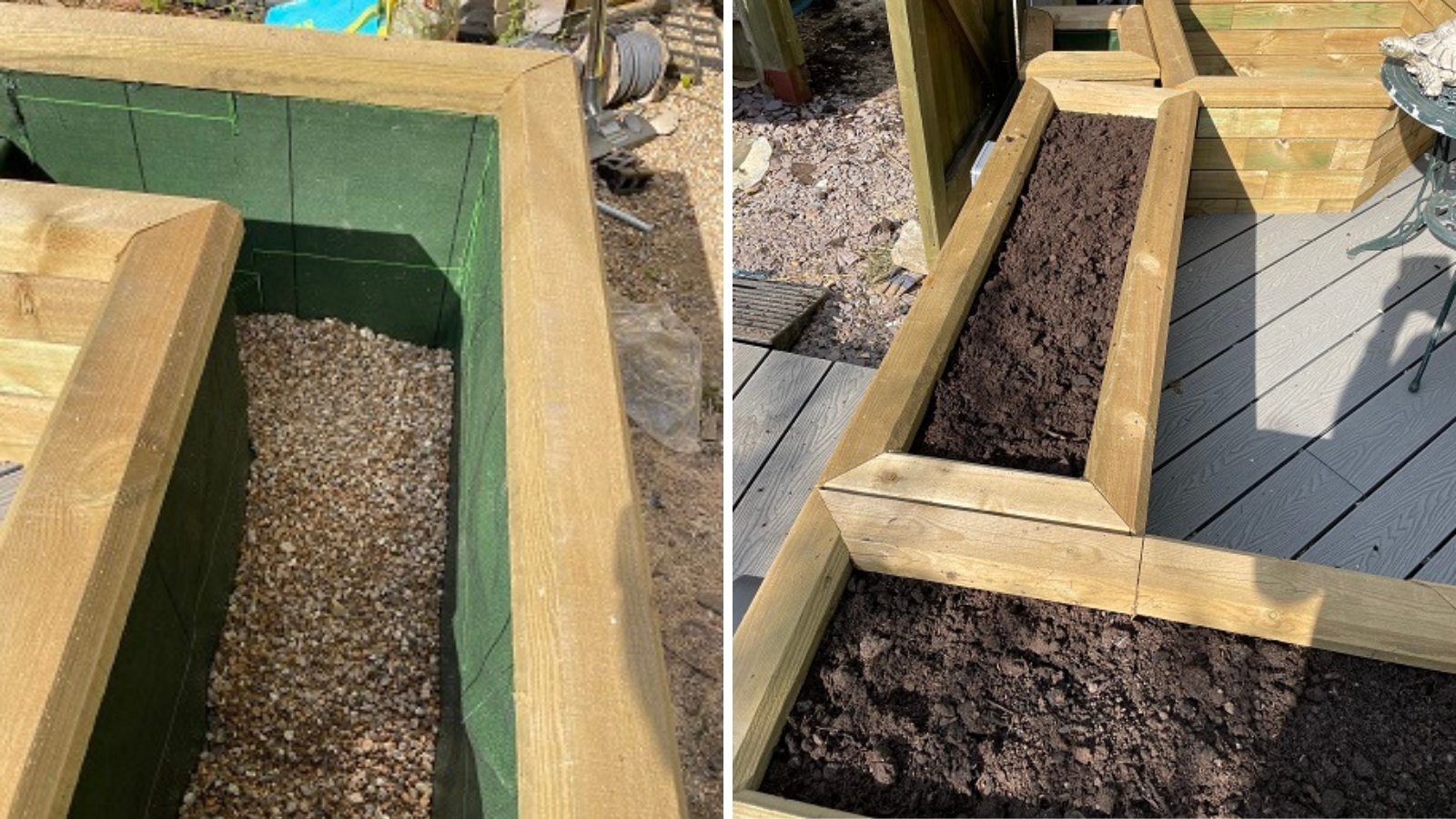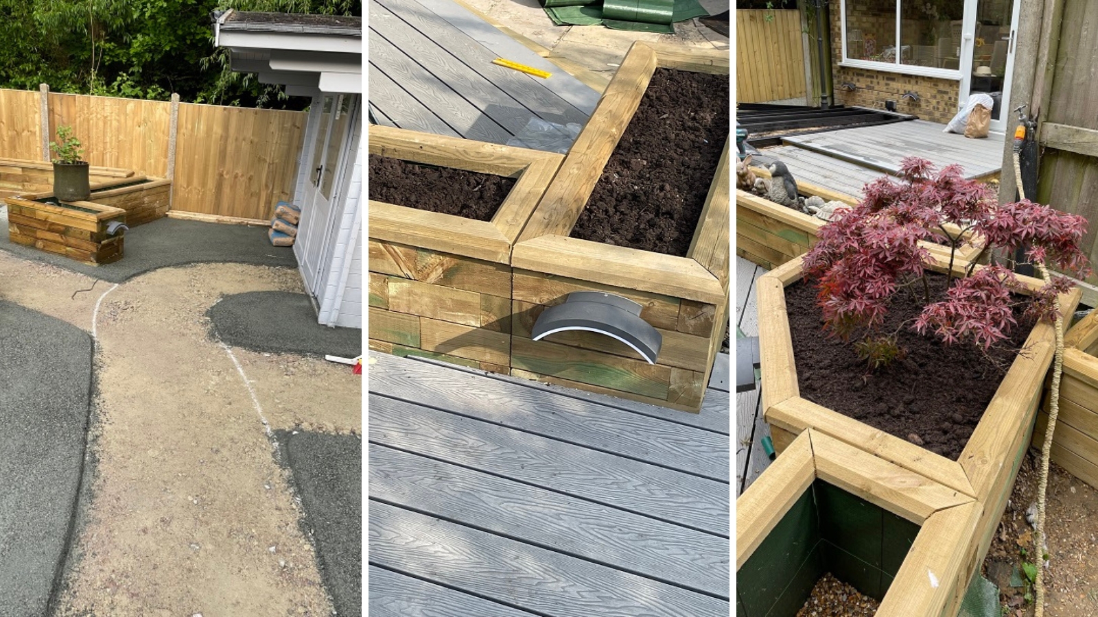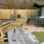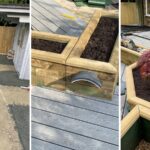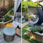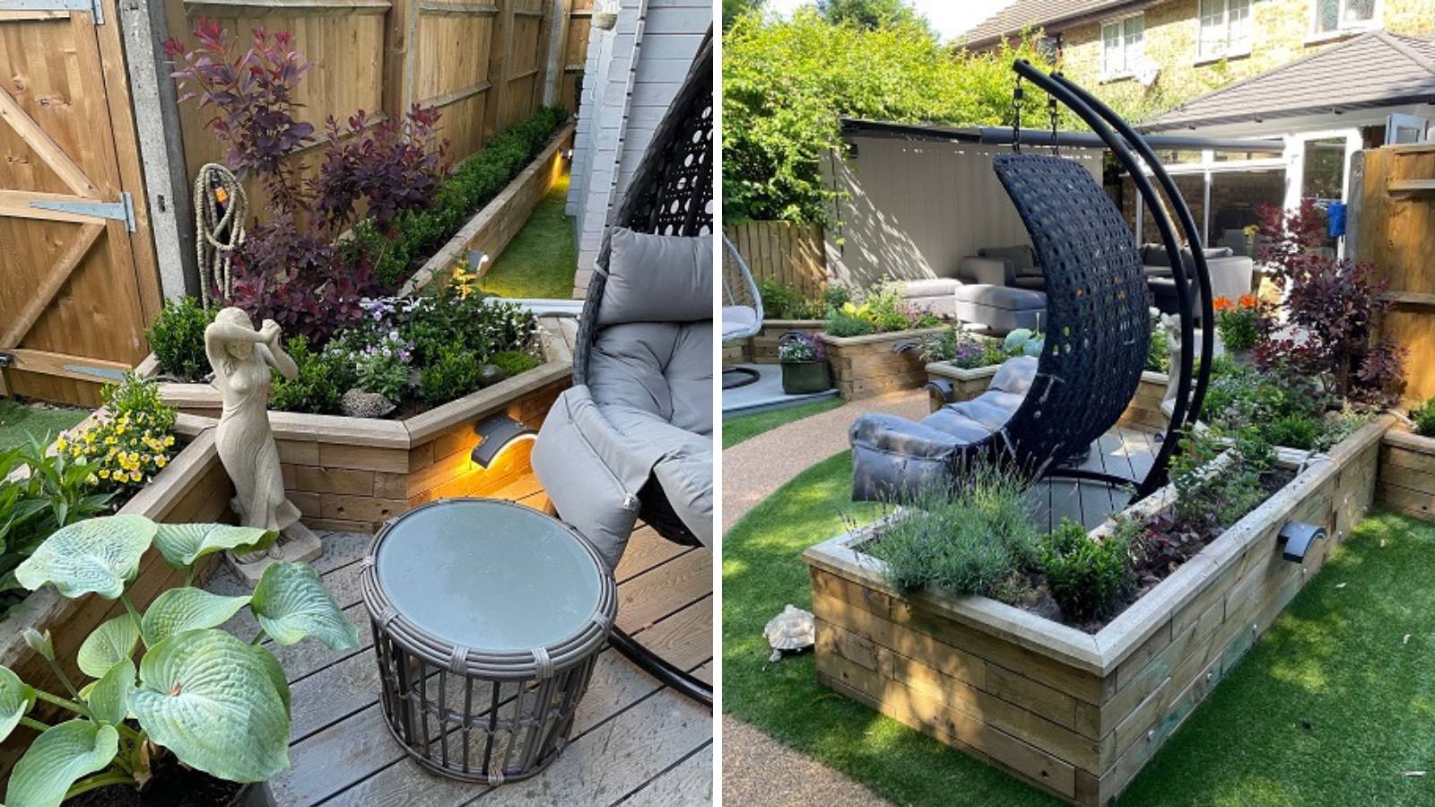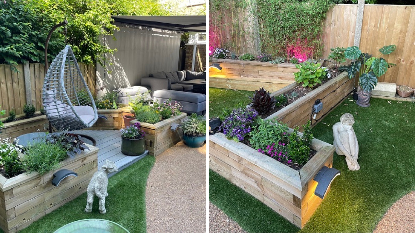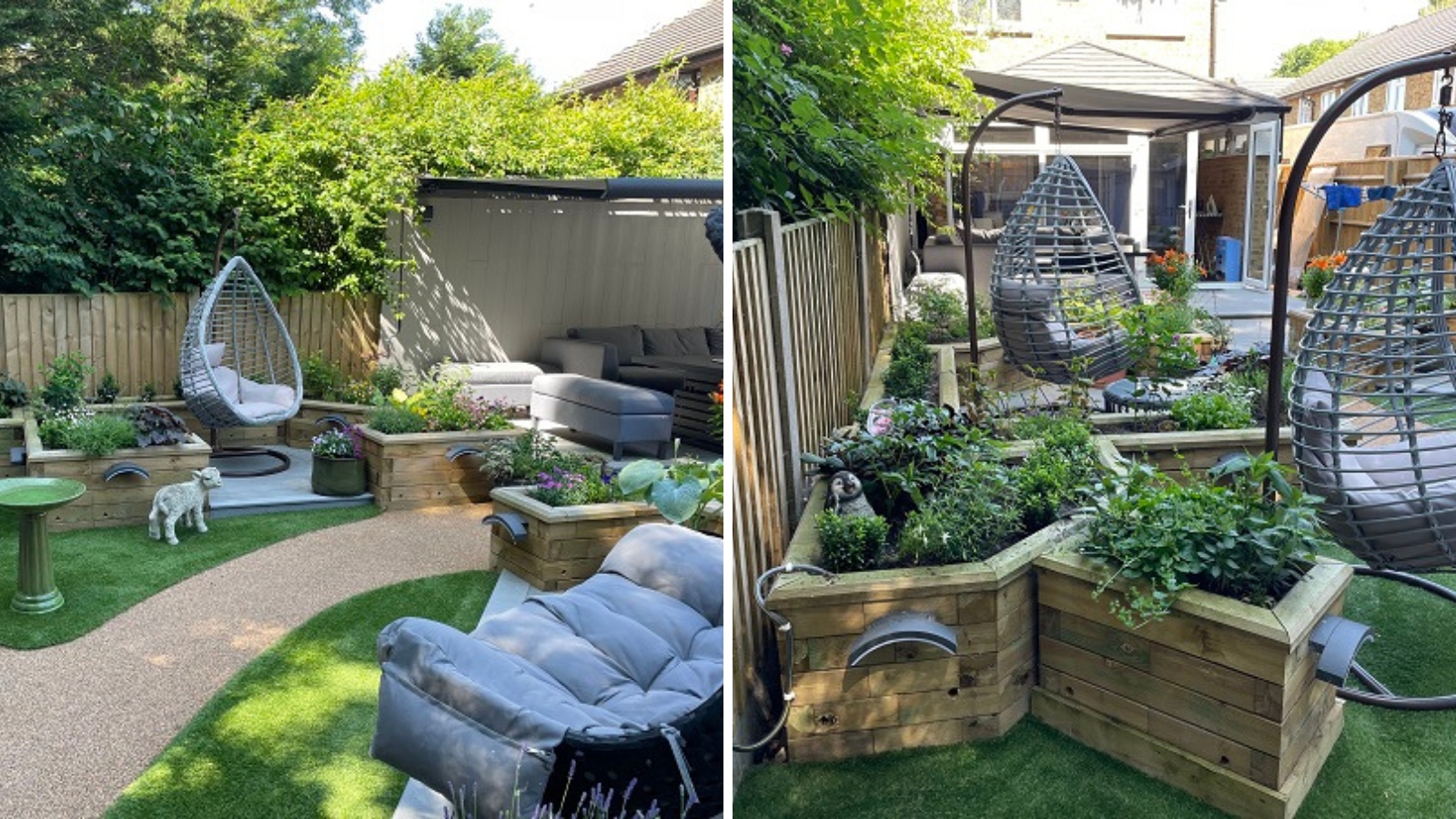 Les jardinières surélevées ont servi à encadrer différentes zones de la terrasse, et à donner davantage de structure et de profondeur au jardin. Notre client a choisi d’utiliser du matériau composite pour la terrasse et y a placé des meubles de jardin moderne, notamment des chaises balançoires et un espace détente pour dîner à la fraîche.