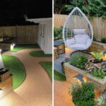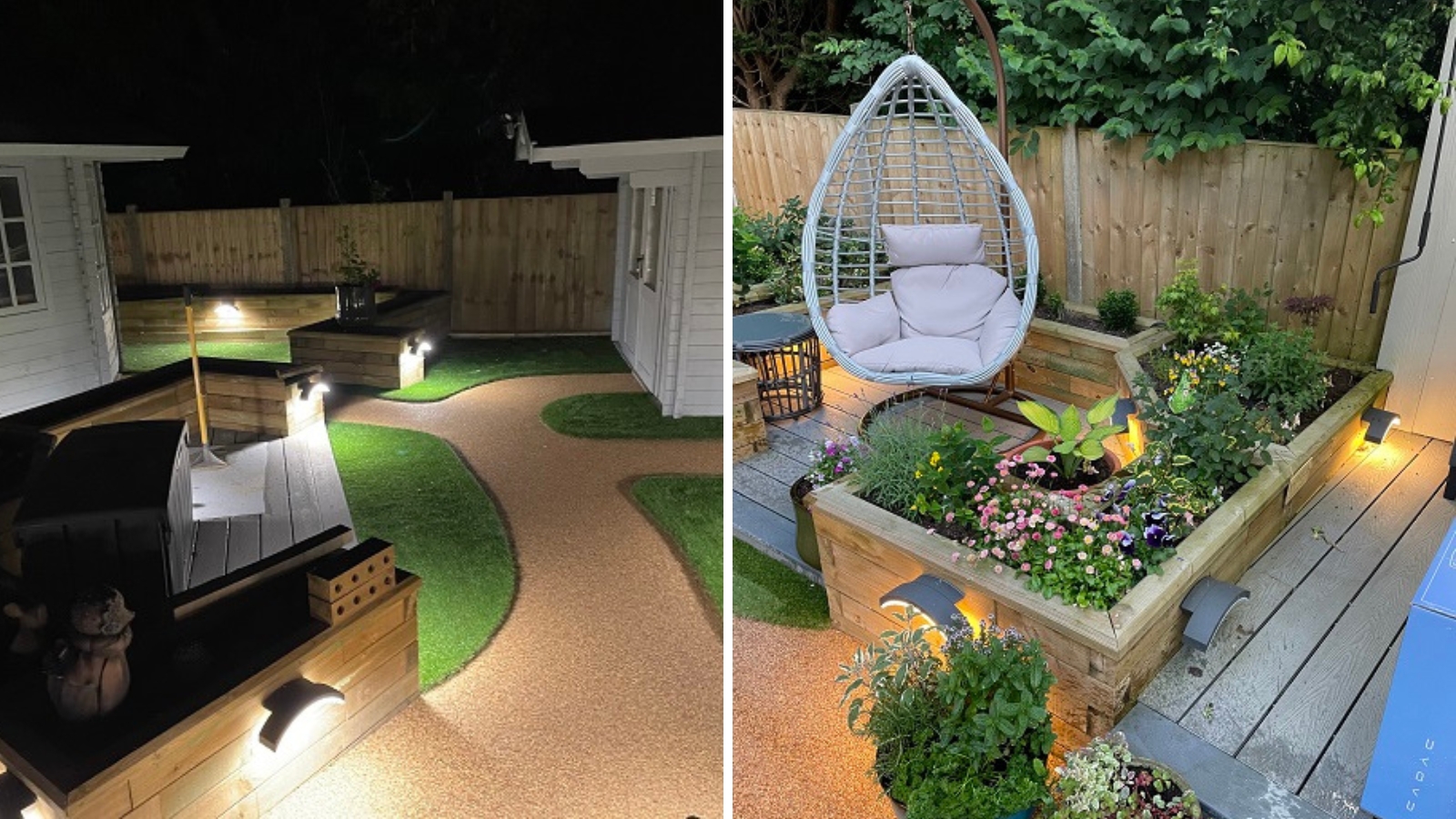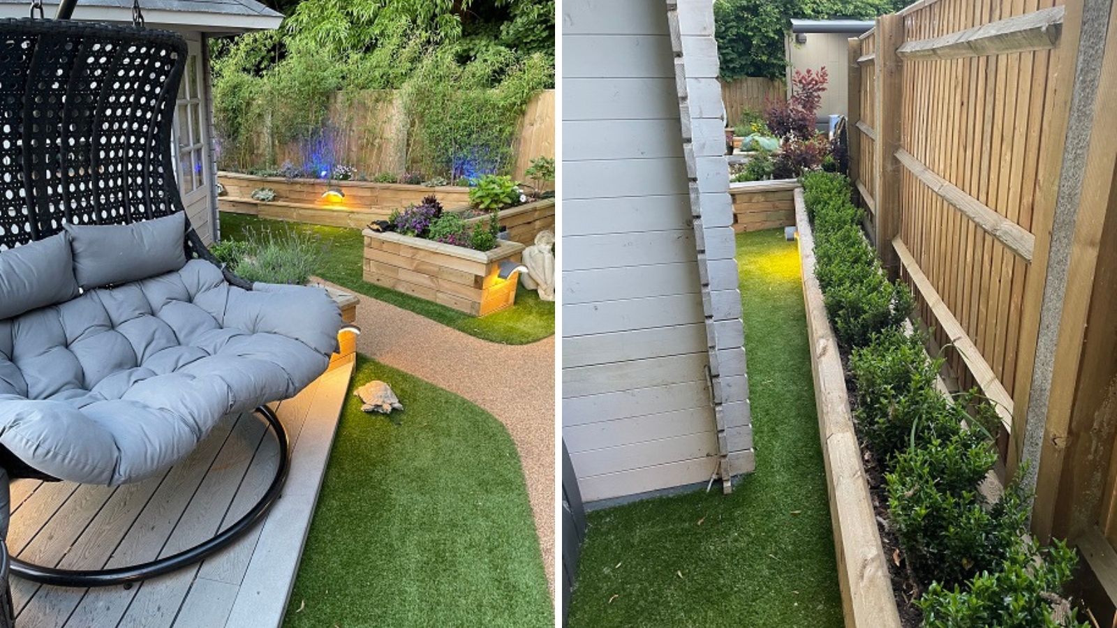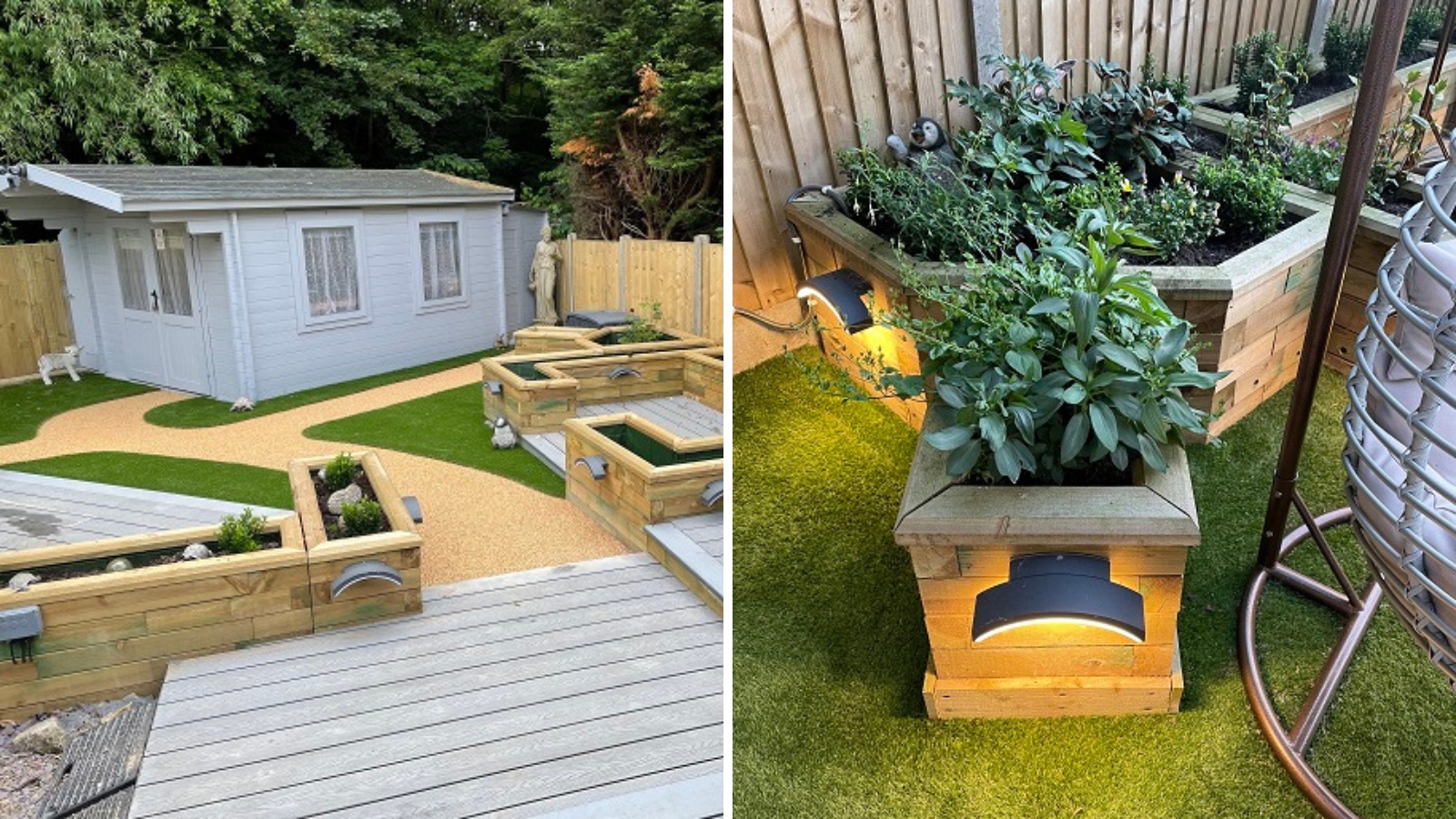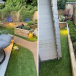 Entre chaque jardinière surélevée, il a mis du gazon artificiel pour créer une trame qui relie les éléments du jardin entre eux. Notre client a ajouté un éclairage sous le rebord des jardinières pour mieux encadrer l’allée. Cela apporte la touche finale chaleureuse et accueillante à ce jardin où il fait bon se détendre avec ses proches.