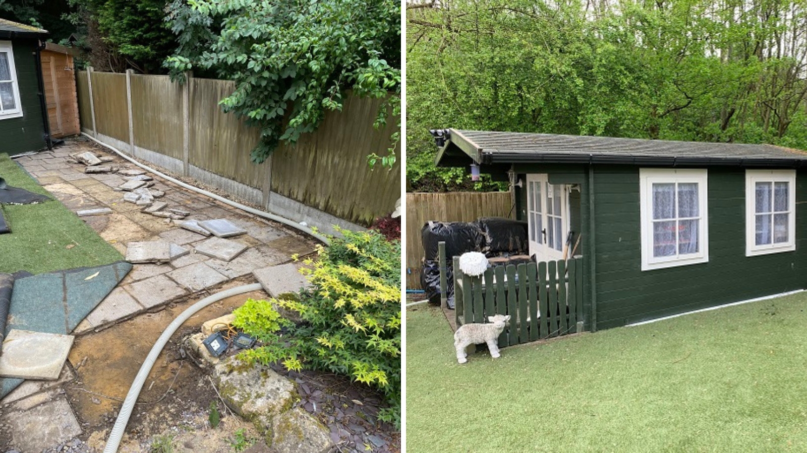 Ce jardin était tristounet et mal entretenu, avec une terrasse défoncée et des plantations peu harmonieuses, à même le sol. La cabane de jardin était en bon état, mais semblait détachée du reste du jardin en l’absence d’une allée y menant directement de la pelouse. La clôture autour du jardin avait grand besoin de verdure pour adoucir l’espace. En gros, c’était l’occasion idéale d’améliorer un espace avec des bacs et jardinières surélevées.