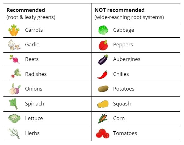 Les légumes-feuilles et les légumes-racines comme les carottes et les oignons adorent cette méthode de jardinage. Évitez de cultiver des plantes avec des systèmes racinaires étendus, comme les tomates ou les courgettes.