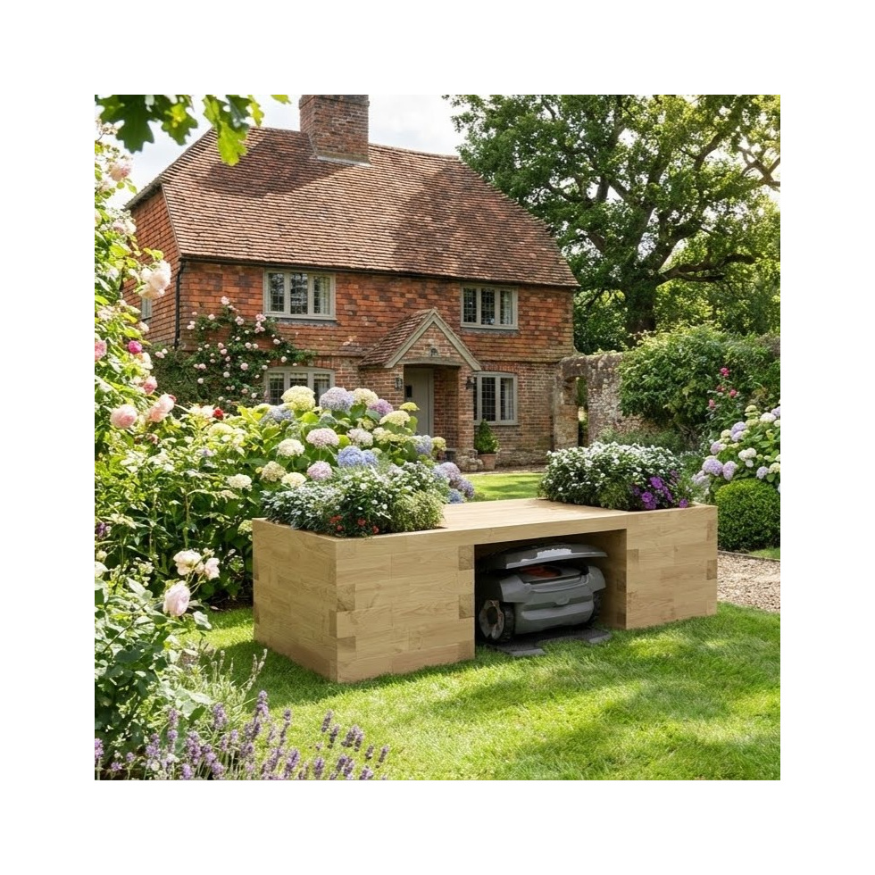 Garage pour robot tondeuse avec banc et jardinière / 2,025 m x 0,9 m x 0,55 m