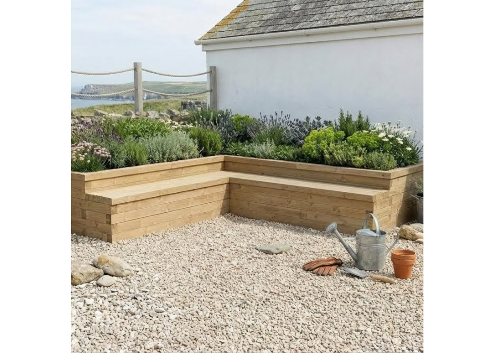 Jardinière bois en L avec banc de jardin 3.75 x 3.75 x 0.65m