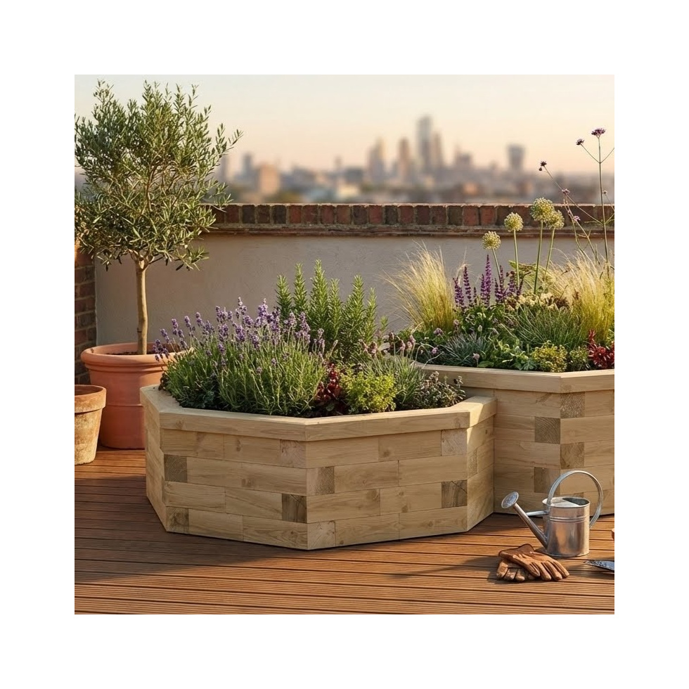 Ensemble jardinières bois octogonales à deux niveaux 254,8 x 152,4 x 55 cm