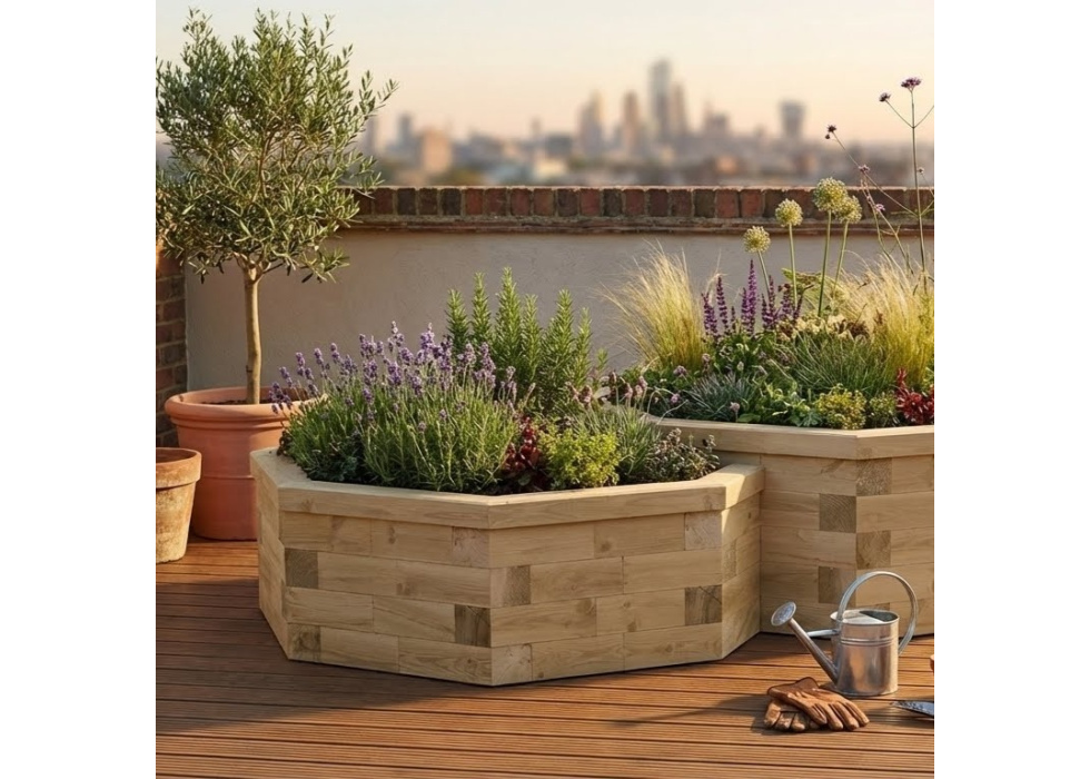 Deux jardinières octogonales réunies pour créer une forme unique et apporter du relief avec ses deux hauteurs différentes
